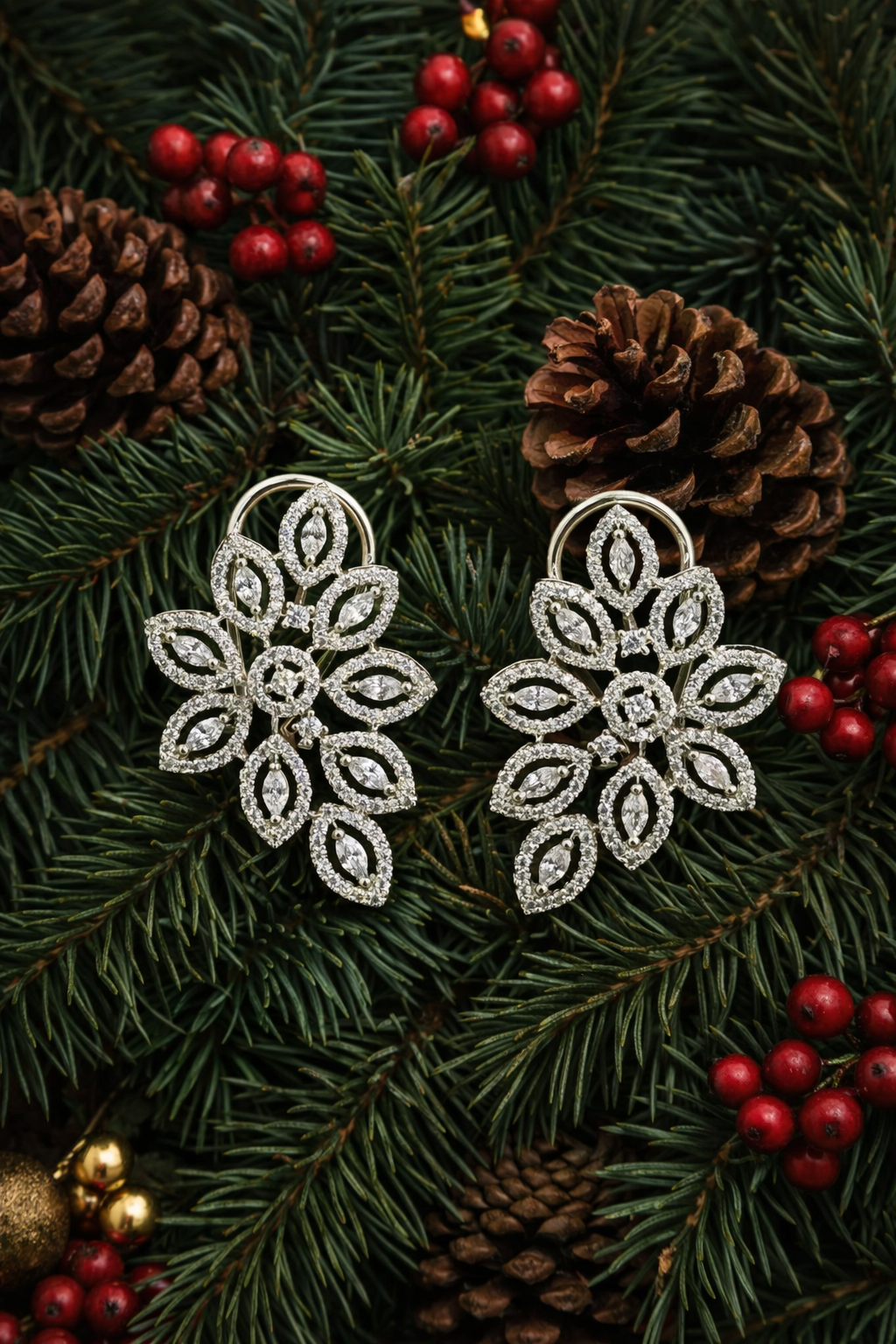 Delicate yet dazzling, Celeste Fleur is inspired by blooming florals kissed by winter light. These statement earrings feature intricately arranged marquise-cut stones forming a radiant flower silhouette, each petal outlined with fine brilliance for depth and sparkle. The design feels airy yet opulent, capturing the beauty of nature translated into timeless craftsmanship.