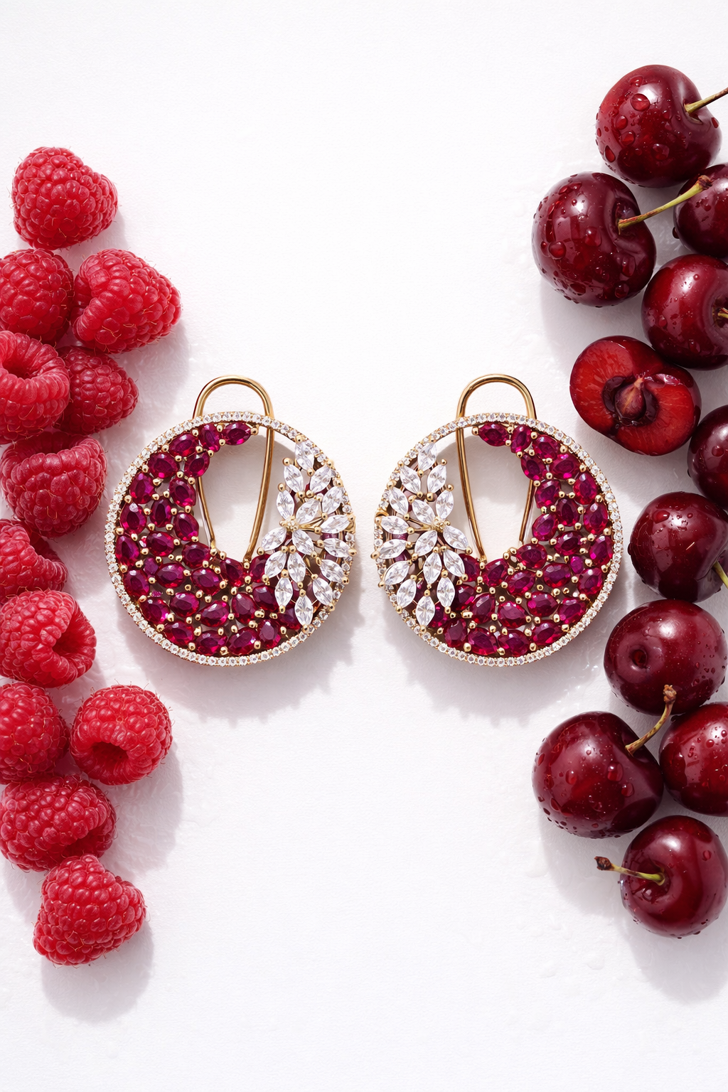The Crimson Bloom Chand Earrings blend heritage inspiration with modern glamour. A sweeping crescent of deep red stones is paired with a radiant floral motif crafted from sparkling zircon stones, creating a look that is both powerful and graceful. Designed to stand out effortlessly, these earrings elevate festive attire while remaining timeless enough to treasure for years.