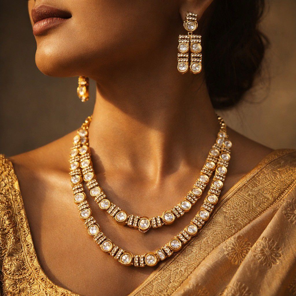 A timeless ode to heritage craftsmanship, the Elara Heritage Set embodies the regal elegance of traditional Indian jewellery. Meticulously crafted with luminous kundan work and precision-set zircon stones, this set radiates a refined brilliance that mirrors the grandeur of royal heirlooms.