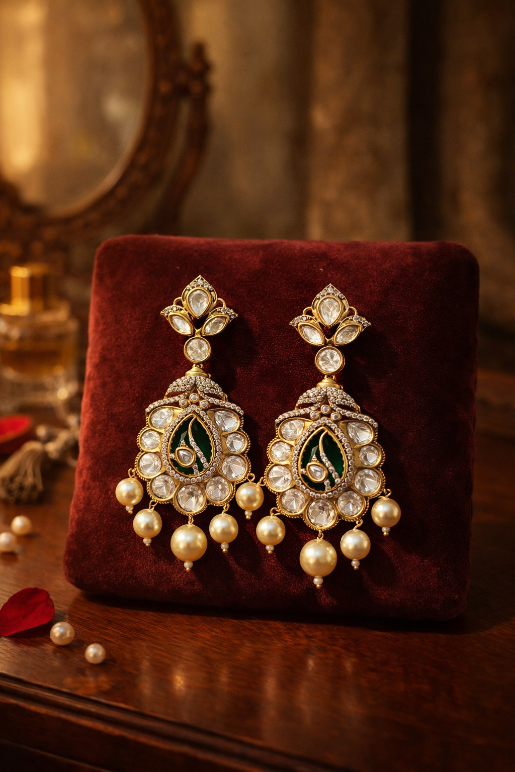 A bold expression of regal femininity, these statement chandelier earrings feature a sculpted emerald-toned centre framed by luminous kundan stones in a floral halo setting. Intricately layered gold detailing and pavé accents create depth and brilliance, while cascading pearl drops add softness and movement.
