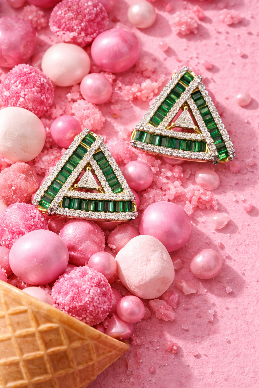 Bold and architectural, the Emerald Prism, feature a striking triangular silhouette layered with emerald-green baguette stones and shimmering white accents. A brilliant central stone anchors the design, creating depth and symmetry within the geometric form. Finished in radiant gold plating, these earrings balance sharp structure with luminous sparkle—perfect for statement styling with a playful, couture edge