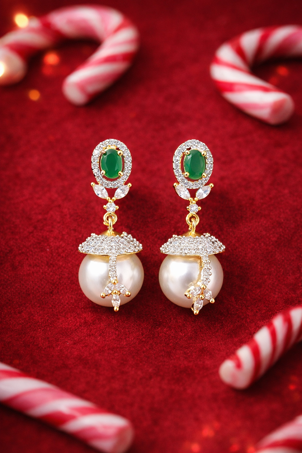 Festive yet exquisitely refined, Holly Pearl is a statement pair of earrings that blends holiday charm with heirloom-inspired luxury. The design features a rich emerald-green centre stone framed by shimmering brilliance, cascading into a lustrous pearl drop crowned with intricate crystal detailing. The balance of vivid green, soft pearl glow, and warm gold accents creates a look that feels both celebratory and timeless.