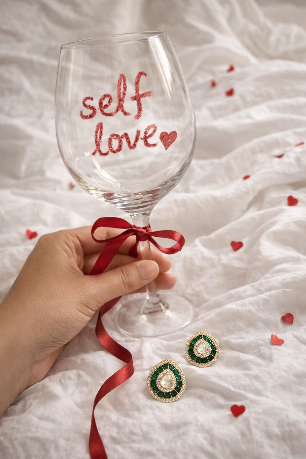 Statement teardrop studs crafted with a radiant pear-cut Kundan Polki center and a double halo of emerald-toned and zircon stones. A bold yet graceful piece designed to elevate any look.