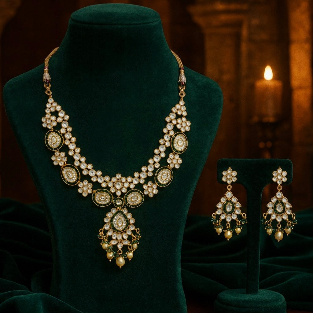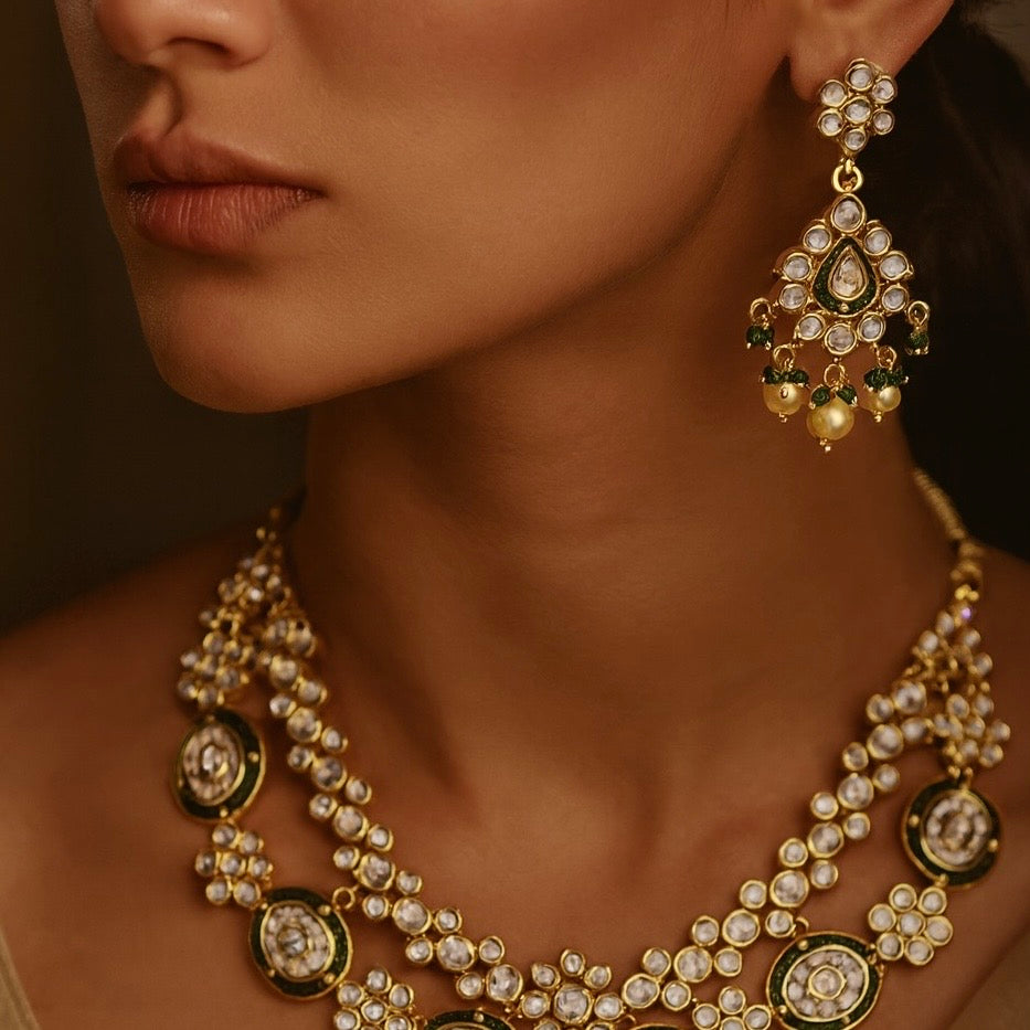 Radiating refined splendour, Mehr-e-Noor is a jewellery set that captures the poetry of heritage craftsmanship and luminous beauty. This elegant necklace is adorned with meticulously set Polki stones, arranged in graceful layers that flow effortlessly along the neckline. Accented with subtle hints of green and framed in warm gold tones, the design culminates in a striking pendant that glows with depth, symmetry, and timeless charm.