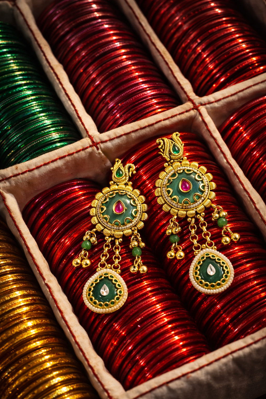 Set against bold red bangles, the colour harmony of emerald, ruby, and gold feels unmistakably bridal and celebratory. Designed for mehndi nights, wedding festivities, and joyous gatherings, these earrings are a statement of heritage - bold, radiant, and unforgettable.