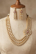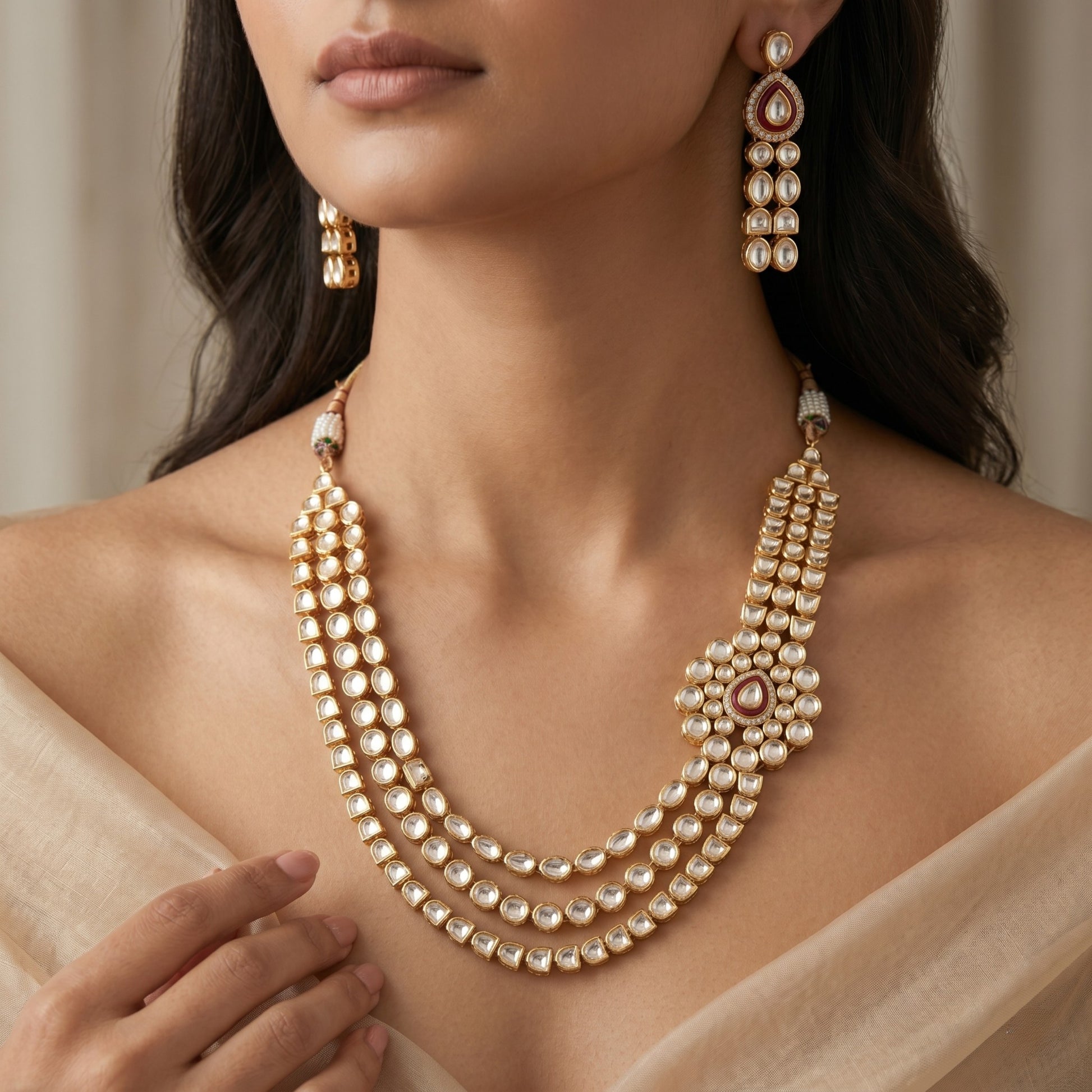 Each element is thoughtfully composed - featuring handpicked zircons that lend brilliance while preserving the soft, organic glow of traditional uncut Polki. The layered silhouette creates a graceful drape, while the central motif adds a touch of regal asymmetry reminiscent of Mughal-era adornment.