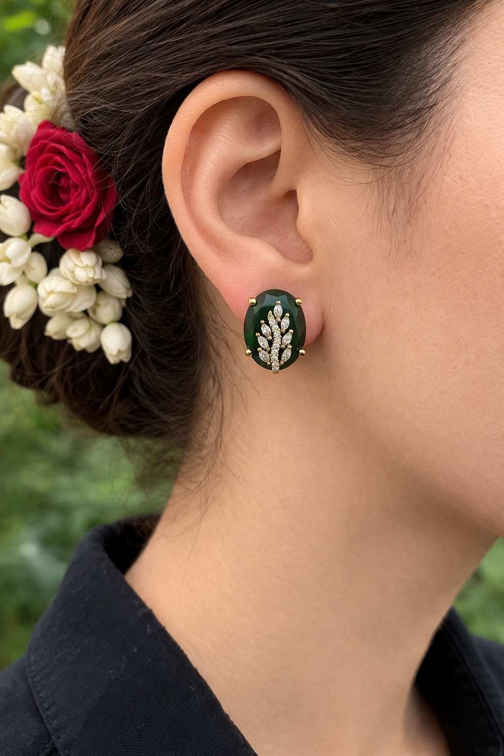 The contrast between the bold emerald core and the fine, intricate zircon detailing creates a balance of strength and softness — making these studs both versatile and distinctive. Designed for effortless wear, they bring a touch of heritage-inspired sophistication to both everyday and occasion dressing.