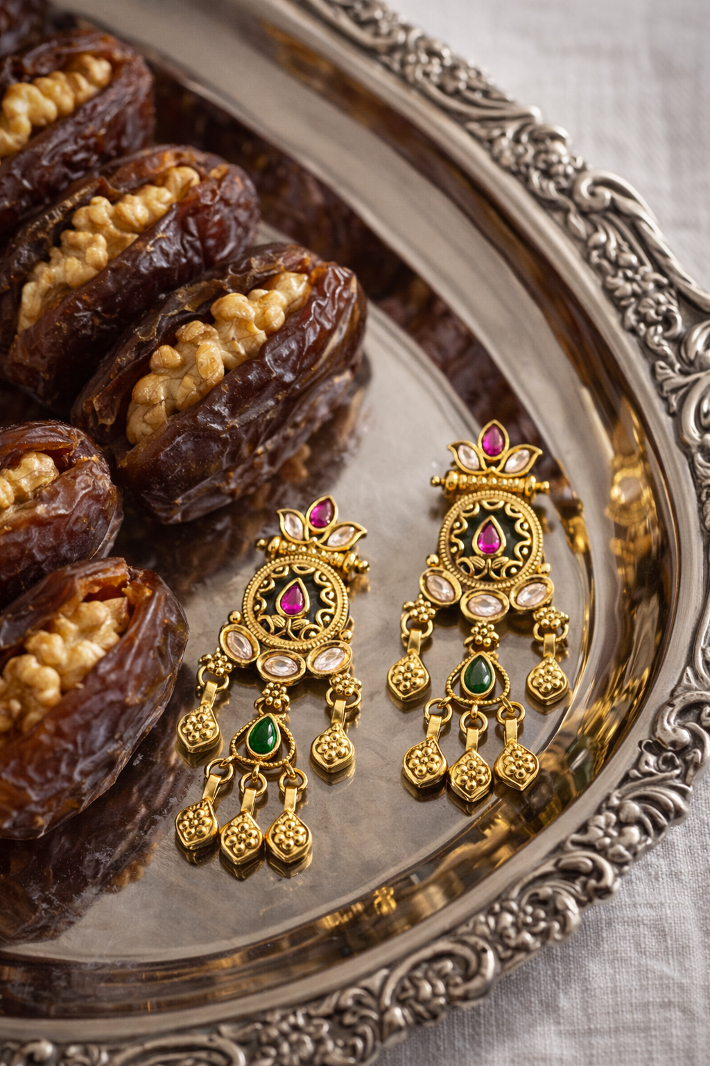 A celebration of heritage artistry, these earrings bring together rich colour, intricate detailing, and timeless craftsmanship.