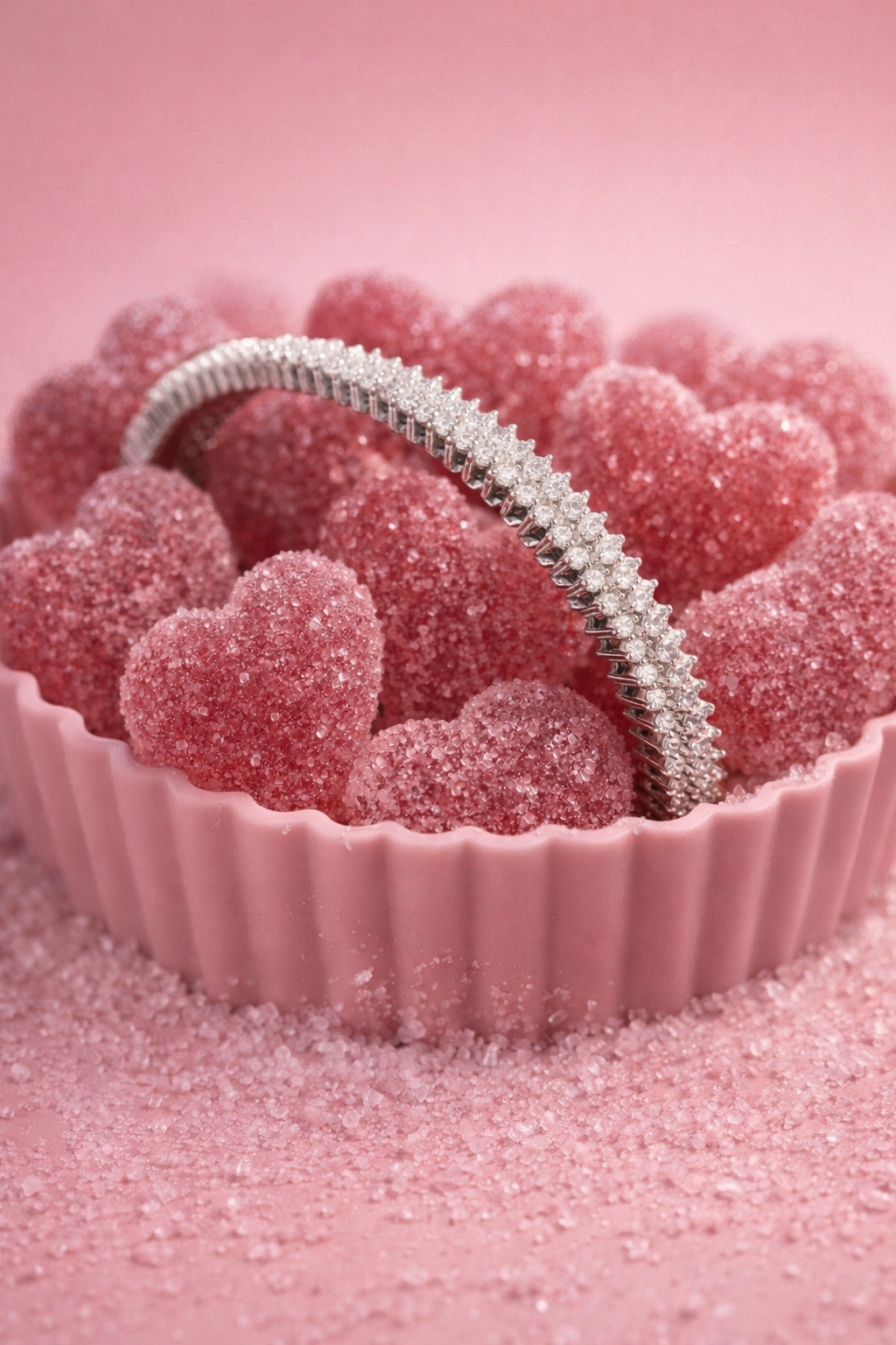 The Rosé Reverie Bangle is a delicate ode to sweetness and sophistication. Crafted with a slim, sculpted band, it features a continuous trio of micro-set white zircons that shimmer like sugar crystals under soft light. Elegant yet playful, the bangle curves effortlessly around the wrist, offering a refined sparkle that feels both romantic and modern. Designed to be worn alone for understated luxury or stacked for a luminous statement, this piece captures the magic of soft blush tones and timeless femininity.
