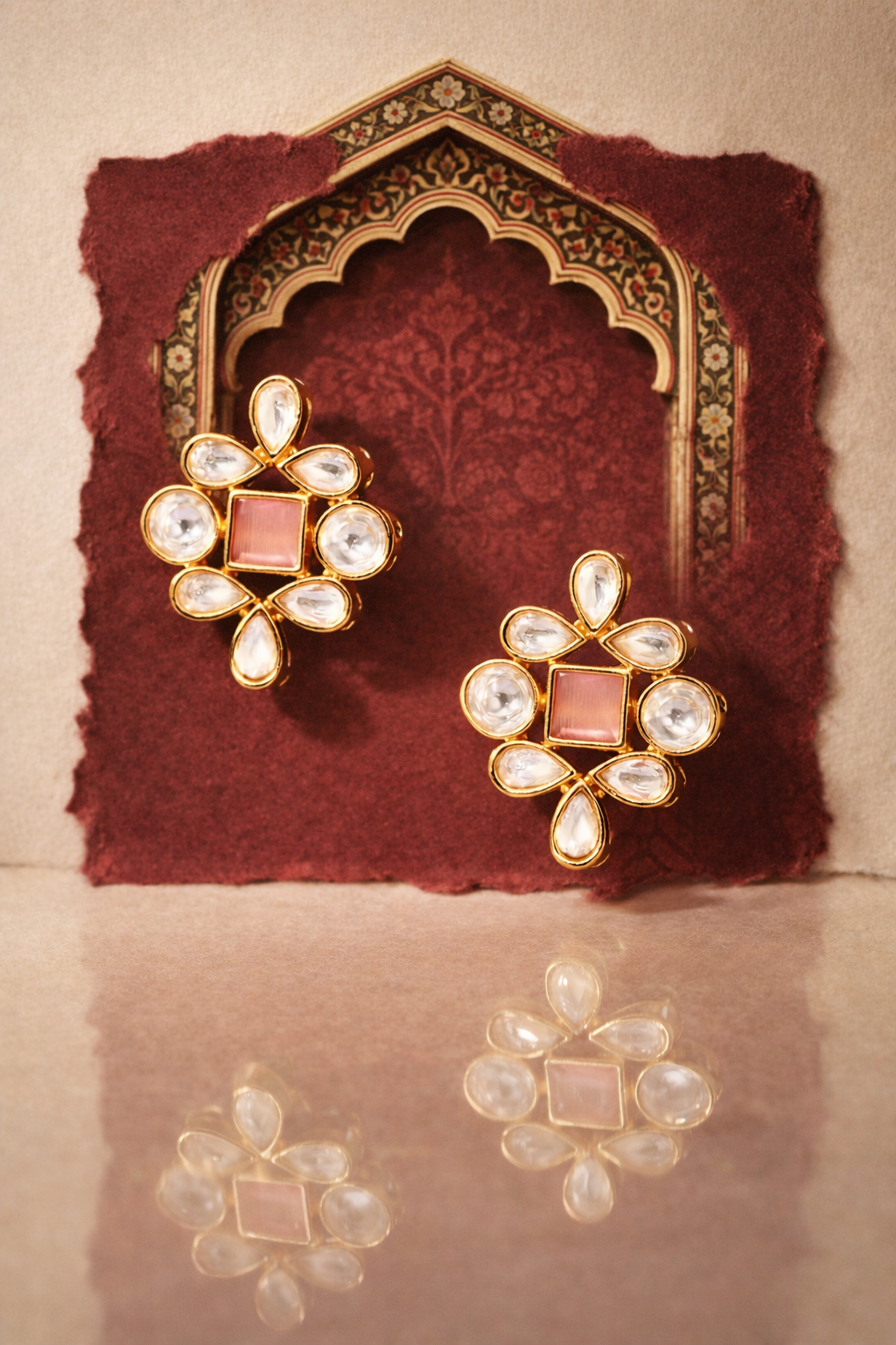 At the center, a blush-toned stone adds depth and softness, creating a subtle contrast against the brilliance of the surrounding Kundan petals. Each element is carefully set to reflect light gently, resulting in a glow that feels warm, inviting, and effortlessly sophisticated.