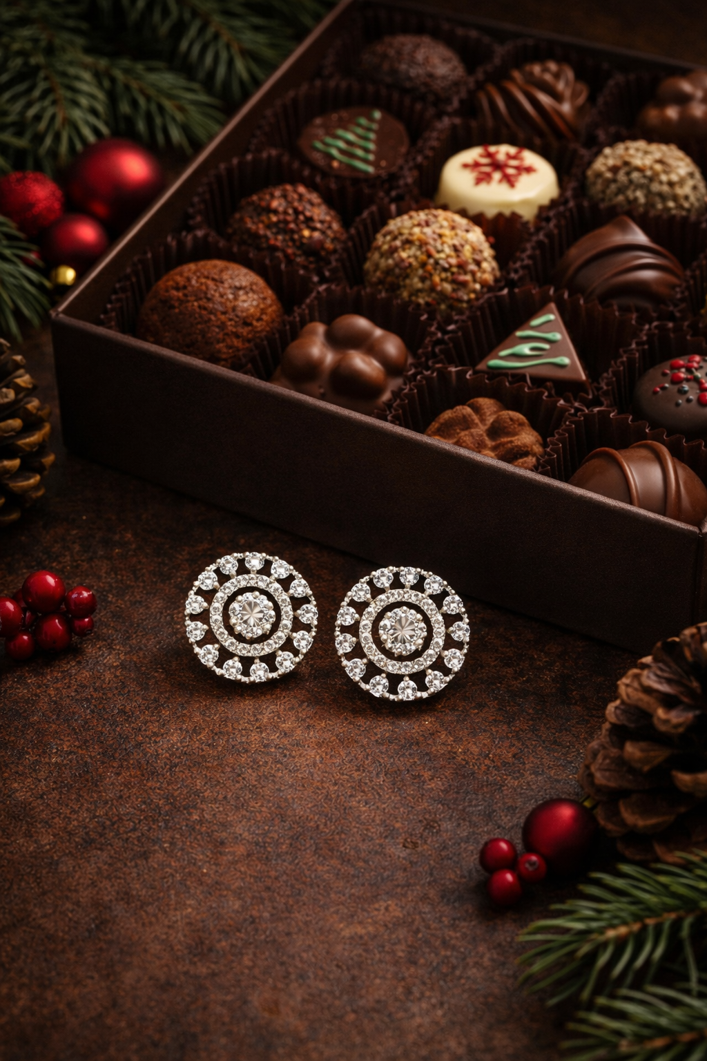 Refined and radiant, Zarrah is a pair of stud earrings designed to capture light in its purest form. Featuring concentric circles of brilliant stones, the design draws the eye inward to a luminous floral centre, symbolising harmony, balance, and timeless elegance. Each stone is carefully set to create depth and sparkle, offering a graceful play of brilliance with every movement.